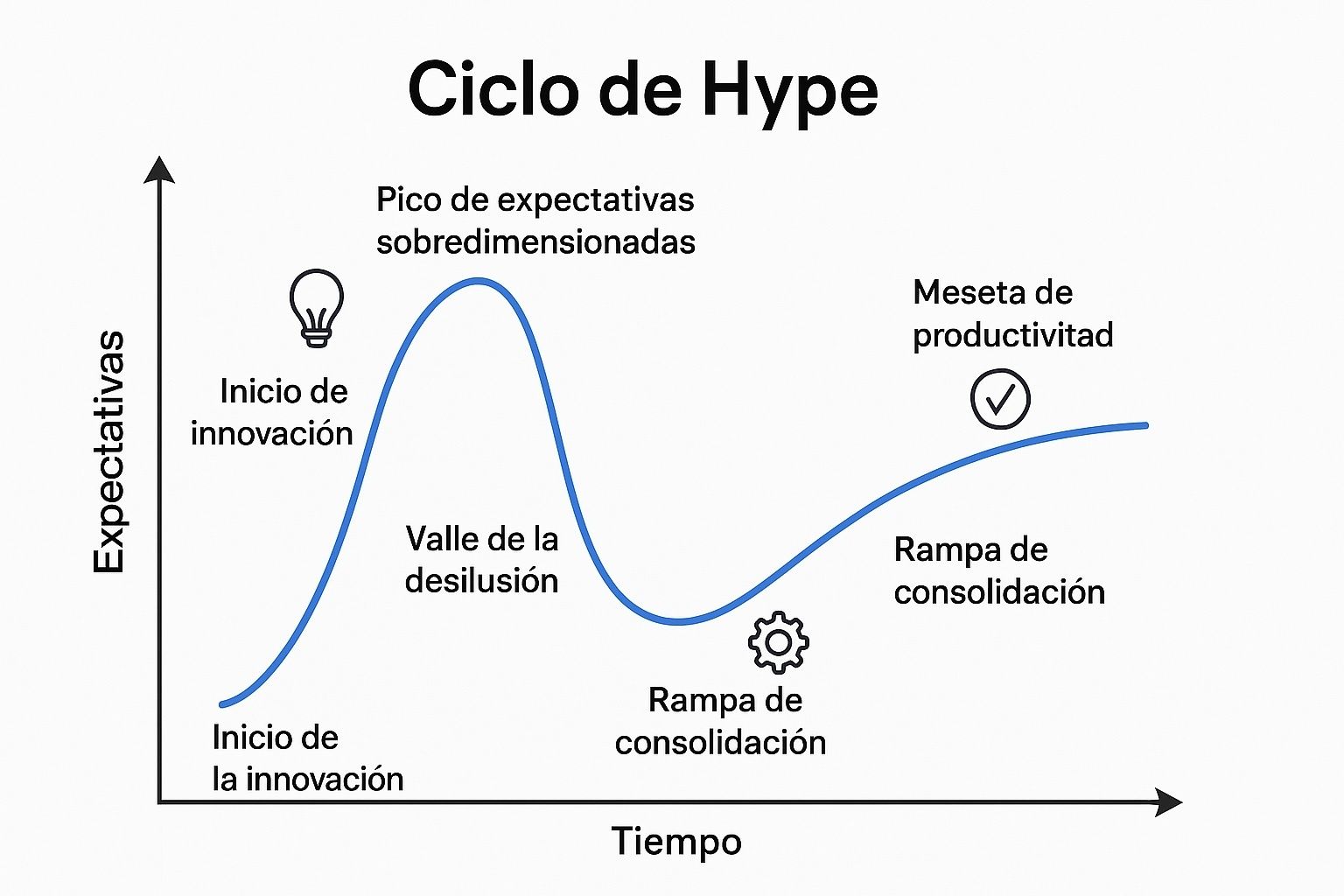 Un ciclo de hype, popularizado por Gartner, describe el recorrido típico de las nuevas tecnologías a través de expectativas infladas, desilusión inevitable y adopción práctica eventual.