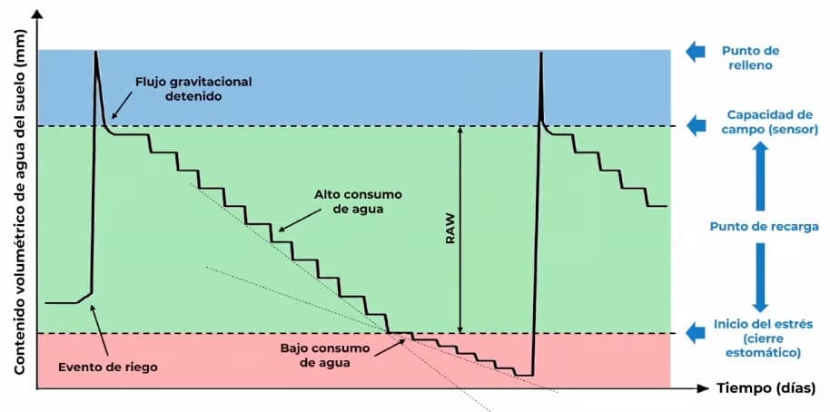 Pero falta una parte esencial: comprobar que esa agua realmente llegó al suelo, a la profundidad correcta, sin perderse por percolación y sin generar estrés hídrico.